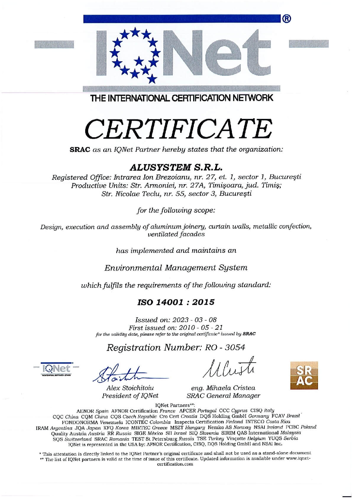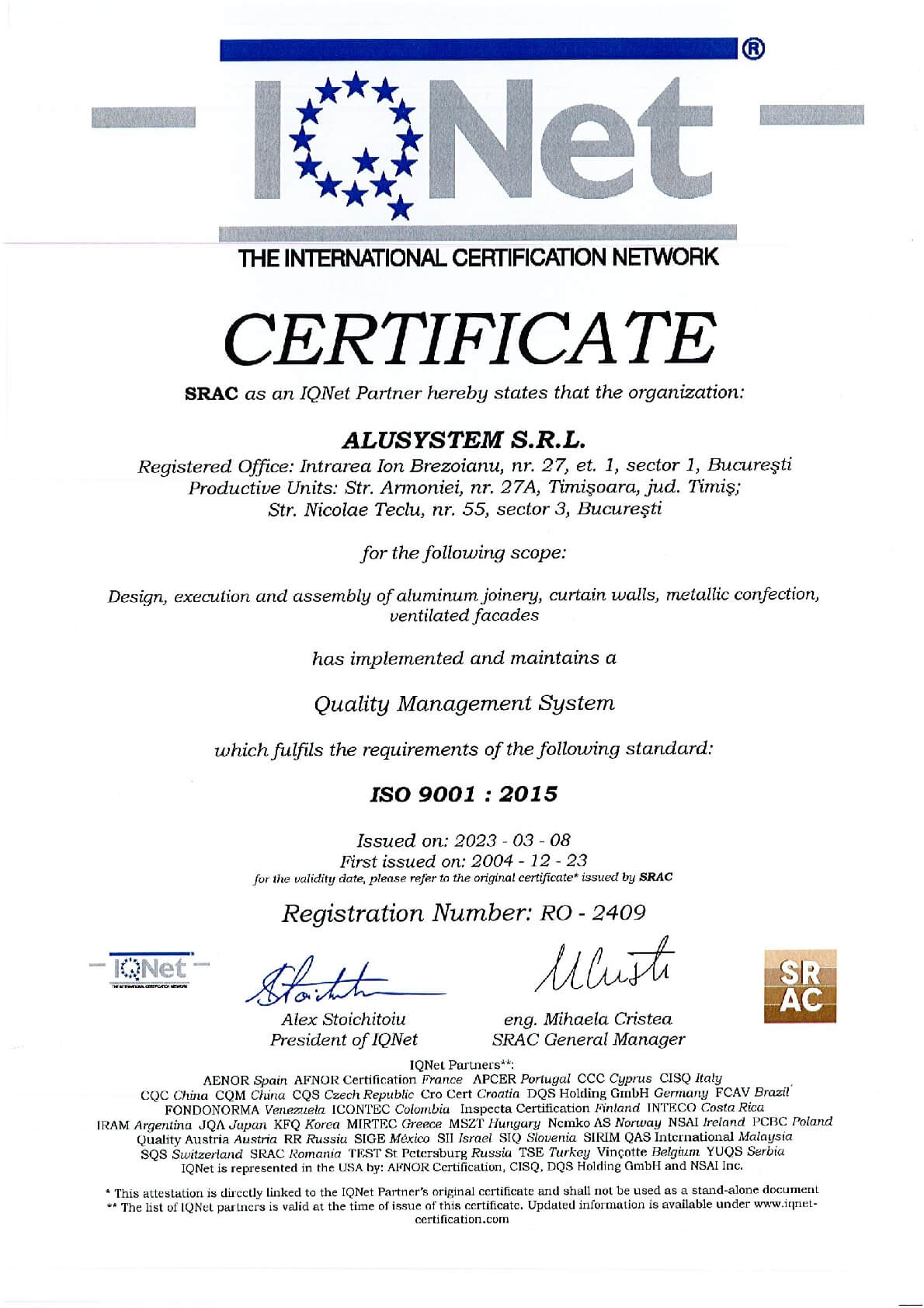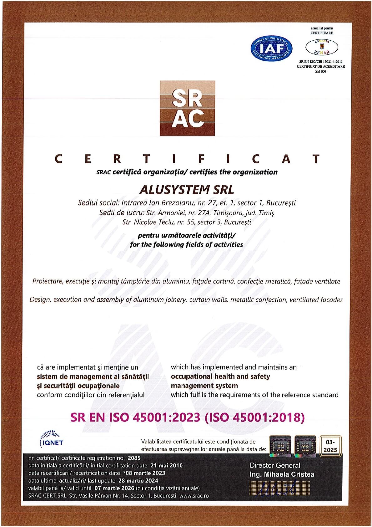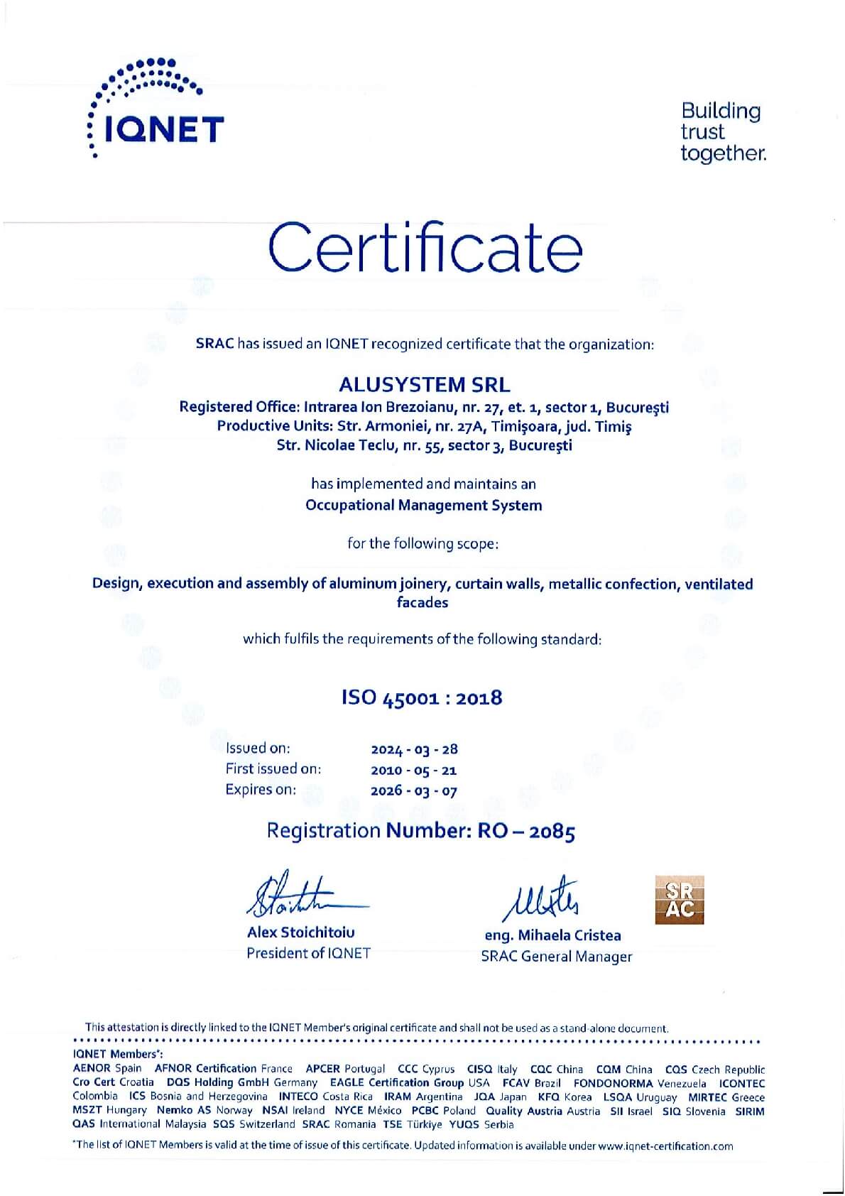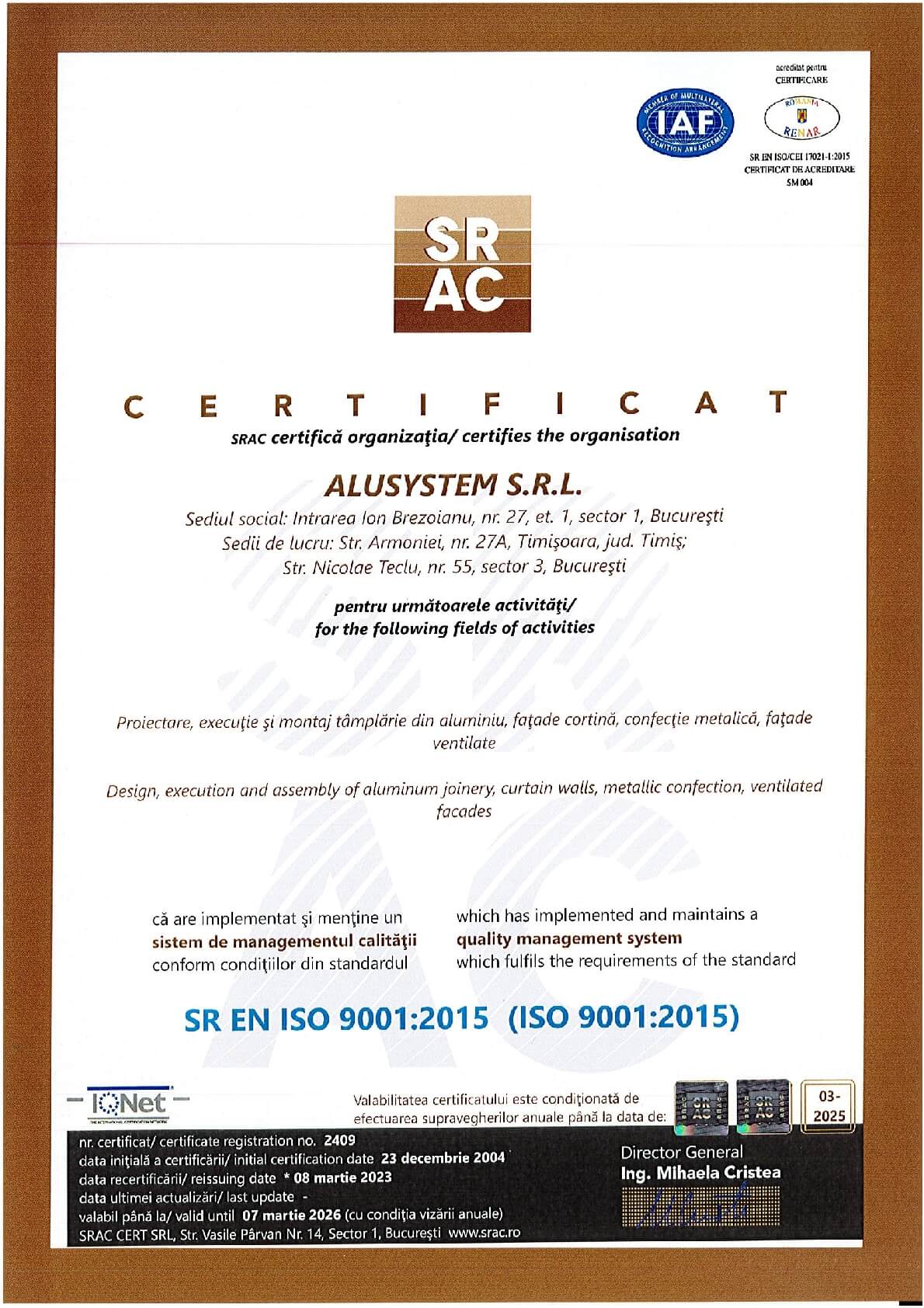 De peste două decenii, Alusystem transformă standardele în artă, purtând cu mândrie certificările ISO 9001, ISO 14001 și ISO 45001, simboluri ale perfecțiunii atinse prin rigoare, pasiune și responsabilitate.